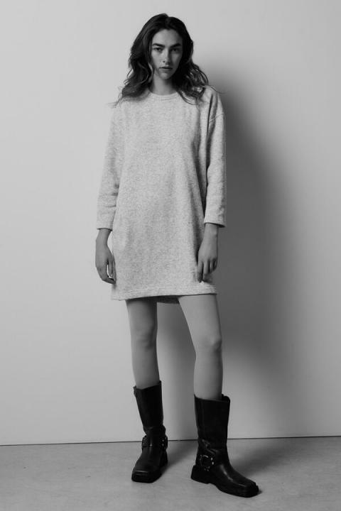La robe Evona, confectionnée dans une matière très douce à l’esprit polaire fine, offre un confort irrésistible tout en restant élégante. Sa texture agréable et légère rappelle la chaleur de la polaire, mais avec une finesse qui la rend parfaitement adaptée pour un look décontracté ou habillé.Coupe ample et courteManches longuesEncolure bateauEmmanchures bassesMélange avec de l’élasthanne pour plus de confortMatière doudou esprit polaire fineOversize. Se porte ample, prenez votre taille habituelle.